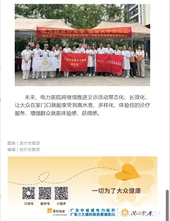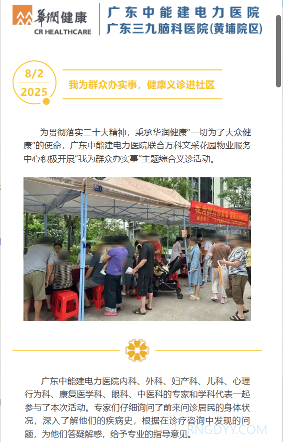 本院动态 联系电话:020-82078966 邮箱:rngd@crmedical.hk 【QQ咨询】: 我为群众办实事 | 电力医院到万科黄埔新城开展“我为群众办实事,健康义诊进社区”综合义诊活动 http://www.rngdyy.com 时间:2025-08-05 编辑:广东中能建电力医院 阅读:287 上一篇:喜报!我院护理团队荣膺省级静脉治疗科普大赛多项奖项 下一篇:本院动态 | 脑瘫科住院部及儿童康复治疗部搬迁之你问我答 我要评论: 相关报道: 润心分享 | 区域联动护光明,医养协作暖人心 警示教育敲警钟,守纪护廉树清风|广东中能建电力医院党支部组织参观广东省反腐倡廉教育基地 润心分享 | 断腕重生:医术铸就生命奇迹 谈判采购公告 | 广东中能建电力医院 供应室二层板房改造监理服务项目采购公告 本院动态 | 以考促学强基础,以练促精保安全 ——我院圆满完成2025年第二季度“三基三严”考核工作 润心分享 | 一例糖尿病高渗性昏迷合并酮症酸中毒病例分享及科普 圆满收官 | 电力医院2025年三伏天灸义诊活动深受市民好评! 中国医师节 | “德馨于行,技精于勤”——向所有的医务工作者致敬! 地址:广州市黄埔区黄埔东路2957号志诚楼(门诊部) 黄埔东路3375号大院(住院部) 咨询:020-82078966 邮箱:rngd@crmedical.hk 传真:86(020) 82078027 患者服务小程序 官方订阅号 Copyright 2025 广东中能建电力医院版权所有 粤ICP备20049783号 服务性质:非营利性网站 粤公网安备 号