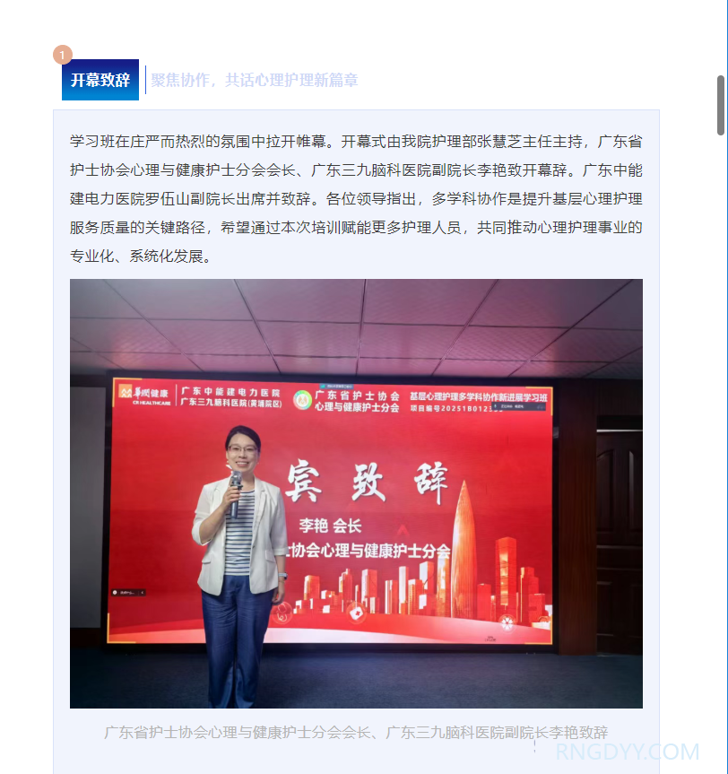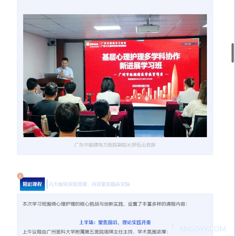 本院动态 联系电话:020-82078966 邮箱:rngd@crmedical.hk 【QQ咨询】: 赋能基层 · 护心前行|我院成功举办市级继续医学教育项目“基层心理护理多学科协作新进展学习班” http://www.rngdyy.com 时间:2025-09-29 编辑:广东中能建电力医院 阅读:17 上一篇:本院动态 | 脑瘫科住院部及儿童康复治疗部搬迁之你问我答 下一篇:我为群众办实事 | 电力医院到塘头雅苑开展“我为群众办实事,健康义诊进社区”综合义诊活动 我要评论: 相关报道: 我为群众办实事 | 电力医院到塘头雅苑开展“我为群众办实事,健康义诊进社区”综合义诊活动 本院动态 | 勠力同心拉练,护佑母婴安全 凝聚青春力量 谱写奋进新篇丨广东中能建电力医院团支部大会顺利召开 本院动态 | 广东中能建电力医院成功开展集中整治医德医风“学习教育月”活动 润心分享 | 25岁小伙疯狂健身差点凉凉! 本院动态 | 热烈祝贺脑瘫科新病区正式启用! 本院动态 | 筑牢安全防线,守护患者安康——电力医院心理行为科国庆节前全面安全排查工作纪实 本院动态 | 我院心理行为科受邀在全国护理学术盛会上分享人文关怀新模式 地址:广州市黄埔区黄埔东路2957号志诚楼(门诊部) 黄埔东路3375号大院(住院部) 咨询:020-82078966 邮箱:rngd@crmedical.hk 传真:86(020) 82078027 患者服务小程序 官方订阅号 Copyright 2025 广东中能建电力医院版权所有 粤ICP备20049783号 服务性质:非营利性网站 粤公网安备 号