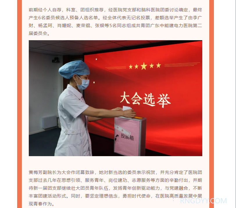 本院动态 联系电话:020-82078966 邮箱:rngd@crmedical.hk 【QQ咨询】: 凝聚青春力量 谱写奋进新篇丨广东中能建电力医院团支部大会顺利召开 http://www.rngdyy.com 时间:2025-10-17 编辑:广东中能建电力医院 阅读:11 上一篇:本院动态 | 广东中能建电力医院成功开展集中整治医德医风“学习教育月”活动 下一篇:我为群众办实事 | 电力医院到塘头雅苑开展“我为群众办实事,健康义诊进社区”综合义诊活动 我要评论: 相关报道: 我为群众办实事 | 电力医院到塘头雅苑开展“我为群众办实事,健康义诊进社区”综合义诊活动 本院动态 | 勠力同心拉练,护佑母婴安全 凝聚青春力量 谱写奋进新篇丨广东中能建电力医院团支部大会顺利召开 本院动态 | 广东中能建电力医院成功开展集中整治医德医风“学习教育月”活动 润心分享 | 25岁小伙疯狂健身差点凉凉! 本院动态 | 热烈祝贺脑瘫科新病区正式启用! 本院动态 | 筑牢安全防线,守护患者安康——电力医院心理行为科国庆节前全面安全排查工作纪实 本院动态 | 我院心理行为科受邀在全国护理学术盛会上分享人文关怀新模式 地址:广州市黄埔区黄埔东路2957号志诚楼(门诊部) 黄埔东路3375号大院(住院部) 咨询:020-82078966 邮箱:rngd@crmedical.hk 传真:86(020) 82078027 患者服务小程序 官方订阅号 Copyright 2025 广东中能建电力医院版权所有 粤ICP备20049783号 服务性质:非营利性网站 粤公网安备 号