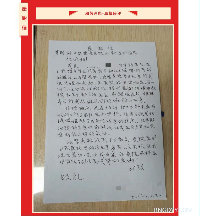 本院动态 联系电话:020-82078966 邮箱:rngd@crmedical.hk 【QQ咨询】: 仁心荣光 | 外科收到患者锦旗和感谢信 http://www.rngdyy.com 时间:2025-11-18 编辑:广东中能建电力医院 阅读:13 上一篇:通知公告 | 关于电力医院儿科夜间门诊暂停的通知 下一篇:--敬请期待-- 我要评论: 相关报道: 仁心荣光 | 外科收到患者锦旗和感谢信 脑瘫科科普时间:什么是颈动脉外膜交感神经网剥脱术 (CPS)? 本院动态 | 我院收到一封来自“12345”的特殊诉求单 通知公告 | 关于电力医院儿科夜间门诊暂停的通知 我为群众办实事 | 电力医院到公园上城开展“我为群众办实事,健康义诊进社区”主题综合义诊活动 以练筑防 守护生命 | 黄埔区危重孕产妇急救演练在我院顺利举行 整改公示 | 2025年服务大讨论问题查摆整改方案公示 激情全运 · 热血同行 | 广东中能建电力医院献血活动 地址:广州市黄埔区黄埔东路2957号志诚楼(门诊部) 黄埔东路3375号大院(住院部) 咨询:020-82078966 邮箱:rngd@crmedical.hk 传真:86(020) 82078027 患者服务小程序 官方订阅号 Copyright 2025 广东中能建电力医院版权所有 粤ICP备20049783号 服务性质:非营利性网站 粤公网安备 号