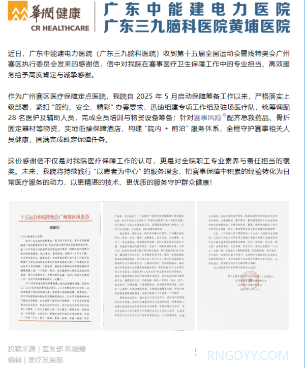 本院动态 联系电话:020-82078966 邮箱:rngd@crmedical.hk 【QQ咨询】: 喜报!我院获十五运会和残特奥会广州赛区执委会感谢信表彰 http://www.rngdyy.com 时间:2026-02-11 编辑:广东中能建电力医院 阅读:47 上一篇:本院动态 | 我院收到一封来自“12345”的特殊诉求单 下一篇:复盘过往,擘画蓝图——广东中能建电力医院2025年度总结表彰大会圆满举行 我要评论: 相关报道: 复盘过往,擘画蓝图——广东中能建电力医院2025年度总结表彰大会圆满举行 春节不打烊 | 广东中能建电力医院(广东三九脑科医院黄埔医院)春节正常开诊 喜报!我院获十五运会和残特奥会广州赛区执委会感谢信表彰 本院动态 | 我院收到一封来自“12345”的特殊诉求单 喜讯!广东中能建电力医院正式增名“广东三九脑科医院黄埔医院” 开诊通知 | 长期失眠、多梦?睡眠门诊今日起正式接诊,助你安享好眠 开诊通知 | 头痛、头晕反复缠?2月2日起,头痛头晕门诊正式开诊,精准诊疗解困扰 本院动态 | “凝聚力量·绽放光芒”广东中能建电力医院举办2026年度辞旧迎新趣味运动会 地址:广州市黄埔区黄埔东路2957号志诚楼(门诊部) 黄埔东路3375号大院(住院部) 咨询:020-82078966 邮箱:rngd@crmedical.hk 传真:86(020) 82078027 患者服务小程序 官方订阅号 Copyright 2026 广东中能建电力医院版权所有 粤ICP备20049783号 服务性质:非营利性网站 粤公网安备 号