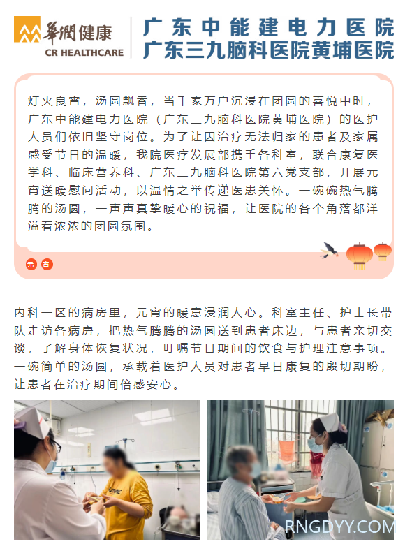 本院动态 联系电话:020-82078966 邮箱:rngd@crmedical.hk 【QQ咨询】: 元宵暖病房 医患共团圆!全院多科室送温情,汤圆甜入心间 http://www.rngdyy.com 时间:2026-03-04 编辑:广东中能建电力医院 阅读:41 上一篇:芳华自在,为爱绽放|广东中能建电力医院妇女节活动圆满举行 下一篇:本院动态 | 夯实区域一体化建设成果 共促医疗质量安全提升——脑科总院医务部莅临我院开展交流访谈 我要评论: 相关报道: 关于调整综合诊查类、妇科类、心血管系统类等医疗服务项目价格的公示 当患者想拔掉那根“管”——血液净化科人文关怀纪实:把诊疗送到家,把温暖送进心 世界昏迷日 | 电力医院在门诊一楼大厅开展世界昏迷日主题综合义诊活动 世界睡眠日 | 电力医院到火村岗头园安置房开展“优质睡眠,美好生活”世界睡眠日综合义诊活动 世界肾脏日 | 关爱肾脏健康——电力医院肾内科开展“2026年世界肾脏日公益惠民义诊活动” 复盘过往,擘画蓝图——广东中能建电力医院2025年度总结表彰大会圆满举行 春节不打烊 | 广东中能建电力医院(广东三九脑科医院黄埔医院)春节正常开诊 喜报!我院获十五运会和残特奥会广州赛区执委会感谢信表彰 地址:广州市黄埔区黄埔东路2957号志诚楼(门诊部) 黄埔东路3375号大院(住院部) 咨询:020-82078966 邮箱:rngd@crmedical.hk 传真:86(020) 82078027 患者服务小程序 官方订阅号 Copyright 2026 广东中能建电力医院版权所有 粤ICP备20049783号 服务性质:非营利性网站 粤公网安备 号