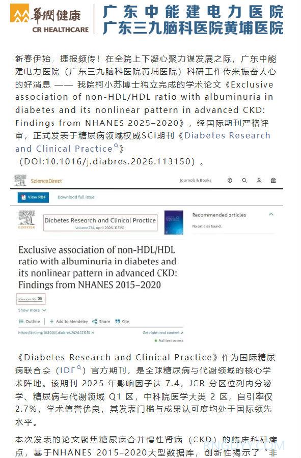 本院动态 联系电话:020-82078966 邮箱:rngd@crmedical.hk 【QQ咨询】: 喜报!我院柯小苏博士学术论文荣登国际权威 SCI 期刊,科研成果再添新彩 http://www.rngdyy.com 时间:2026-02-27 编辑:广东中能建电力医院 阅读:56 上一篇:元宵暖病房 医患共团圆!全院多科室送温情,汤圆甜入心间 下一篇:本院动态 | 夯实区域一体化建设成果 共促医疗质量安全提升——脑科总院医务部莅临我院开展交流访谈 我要评论: 相关报道: 关于调整综合诊查类、妇科类、心血管系统类等医疗服务项目价格的公示 当患者想拔掉那根“管”——血液净化科人文关怀纪实:把诊疗送到家,把温暖送进心 世界昏迷日 | 电力医院在门诊一楼大厅开展世界昏迷日主题综合义诊活动 世界睡眠日 | 电力医院到火村岗头园安置房开展“优质睡眠,美好生活”世界睡眠日综合义诊活动 世界肾脏日 | 关爱肾脏健康——电力医院肾内科开展“2026年世界肾脏日公益惠民义诊活动” 复盘过往,擘画蓝图——广东中能建电力医院2025年度总结表彰大会圆满举行 春节不打烊 | 广东中能建电力医院(广东三九脑科医院黄埔医院)春节正常开诊 喜报!我院获十五运会和残特奥会广州赛区执委会感谢信表彰 地址:广州市黄埔区黄埔东路2957号志诚楼(门诊部) 黄埔东路3375号大院(住院部) 咨询:020-82078966 邮箱:rngd@crmedical.hk 传真:86(020) 82078027 患者服务小程序 官方订阅号 Copyright 2026 广东中能建电力医院版权所有 粤ICP备20049783号 服务性质:非营利性网站 粤公网安备 号
