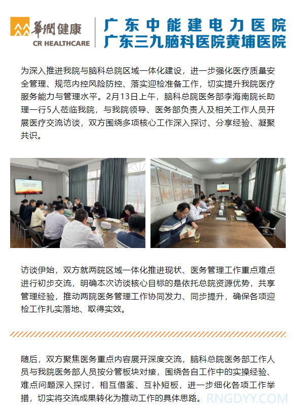 本院动态 联系电话:020-82078966 邮箱:rngd@crmedical.hk 【QQ咨询】: 本院动态 | 夯实区域一体化建设成果 共促医疗质量安全提升——脑科总院医务部莅临我院开展交流访谈 http://www.rngdyy.com 时间:2026-02-14 编辑:广东中能建电力医院 阅读:33 上一篇:心灵绽放,福满新春——心理科举办医患同心迎春系列活动 下一篇:--敬请期待-- 我要评论: 相关报道: 关于调整综合诊查类、妇科类、心血管系统类等医疗服务项目价格的公示 当患者想拔掉那根“管”——血液净化科人文关怀纪实:把诊疗送到家,把温暖送进心 世界昏迷日 | 电力医院在门诊一楼大厅开展世界昏迷日主题综合义诊活动 世界睡眠日 | 电力医院到火村岗头园安置房开展“优质睡眠,美好生活”世界睡眠日综合义诊活动 世界肾脏日 | 关爱肾脏健康——电力医院肾内科开展“2026年世界肾脏日公益惠民义诊活动” 复盘过往,擘画蓝图——广东中能建电力医院2025年度总结表彰大会圆满举行 春节不打烊 | 广东中能建电力医院(广东三九脑科医院黄埔医院)春节正常开诊 喜报!我院获十五运会和残特奥会广州赛区执委会感谢信表彰 地址:广州市黄埔区黄埔东路2957号志诚楼(门诊部) 黄埔东路3375号大院(住院部) 咨询:020-82078966 邮箱:rngd@crmedical.hk 传真:86(020) 82078027 患者服务小程序 官方订阅号 Copyright 2026 广东中能建电力医院版权所有 粤ICP备20049783号 服务性质:非营利性网站 粤公网安备 号