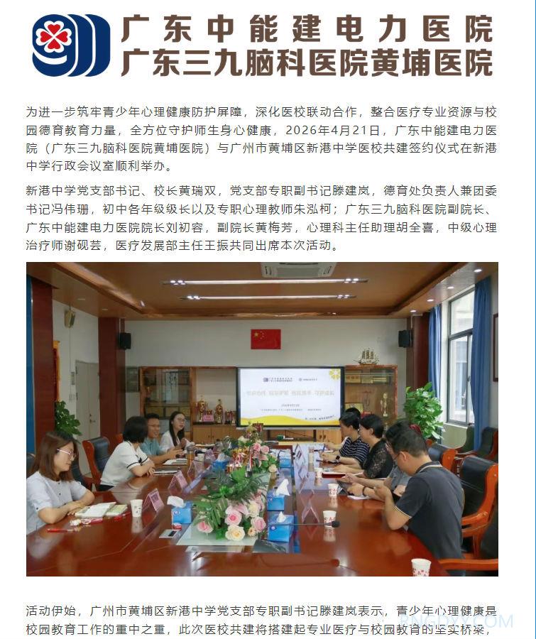 本院动态 联系电话:020-82078966 邮箱:rngd@crmedical.hk 【QQ咨询】: 医校携手 守护成长 | 广东中能建电力医院与新港中学圆满举行医校共建签约活动 http://www.rngdyy.com 时间:2026-04-22 编辑:广东中能建电力医院 阅读:19 上一篇:多方携手送温暖 精准帮扶暖人心 | 我院联合南岗街多部门开展困难群体关爱探访活动 下一篇:本院动态 | 我院走进怡园小学,为特殊儿童家庭送上青春期教育“暖心课” 我要评论: 相关报道: 关于调整综合诊查类、妇科类、心血管系统类等医疗服务项目价格的公示 当患者想拔掉那根“管”——血液净化科人文关怀纪实:把诊疗送到家,把温暖送进心 巾帼绽芳华·奋进她力量 | 致敬医院里闪闪发光的“她” 芳华自在,为爱绽放|广东中能建电力医院妇女节活动圆满举行 元宵暖病房 医患共团圆!全院多科室送温情,汤圆甜入心间 喜报!我院柯小苏博士学术论文荣登国际权威 SCI 期刊,科研成果再添新彩 春节守护“不打烊” | 医者仁心显担当——电力医院医护人员坚守岗位纪实 情暖除夕 爱满院区 | 广东中能建电力医院新春慰问守护健康不打烊 恭祝大家新年快乐 健康平安! 地址:广州市黄埔区黄埔东路2957号志诚楼(门诊部) 黄埔东路3375号大院(住院部) 咨询:020-82078966 邮箱:rngd@crmedical.hk 传真:86(020) 82078027 患者服务小程序 官方订阅号 Copyright 2026 广东中能建电力医院版权所有 粤ICP备20049783号 服务性质:非营利性网站 粤公网安备 号
