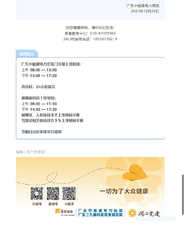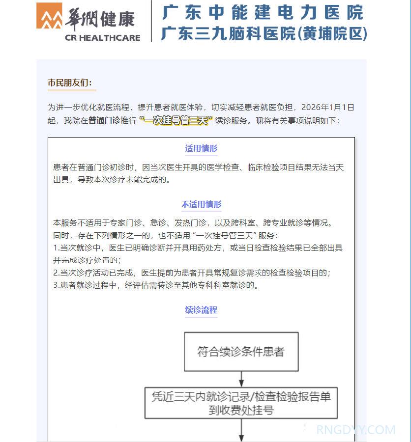 就医指南 联系电话:020-82078966 邮箱:rngd@crmedical.hk 【QQ咨询】: 通知公告 | 广东中能建电力医院推行“一次挂号管三天”惠民便民服务举措 http://www.rngdyy.com 时间:2025-12-29 编辑:广东中能建电力医院 阅读:291 上一篇:通知公告 | 广东中能建电力医院“云胶片”服务上线啦 下一篇:广东中能建电力医院乘车指南 我要评论: 相关报道: 通知公告 | 广东中能建电力医院推行“一次挂号管三天”惠民便民服务举措 通知公告 | 广东中能建电力医院“云胶片”服务上线啦 广东中能建电力医院乘车指南 预约挂号、报告查询、门诊缴费……我院润心患者服务小程序全搞定! 广东中能建电力医院健康体检须知及结果查询 地址:广州市黄埔区黄埔东路2957号志诚楼(门诊部) 黄埔东路3375号大院(住院部) 咨询:020-82078966 邮箱:rngd@crmedical.hk 传真:86(020) 82078027 患者服务小程序 官方订阅号 Copyright 2026 广东中能建电力医院版权所有 粤ICP备20049783号 服务性质:非营利性网站 粤公网安备 号