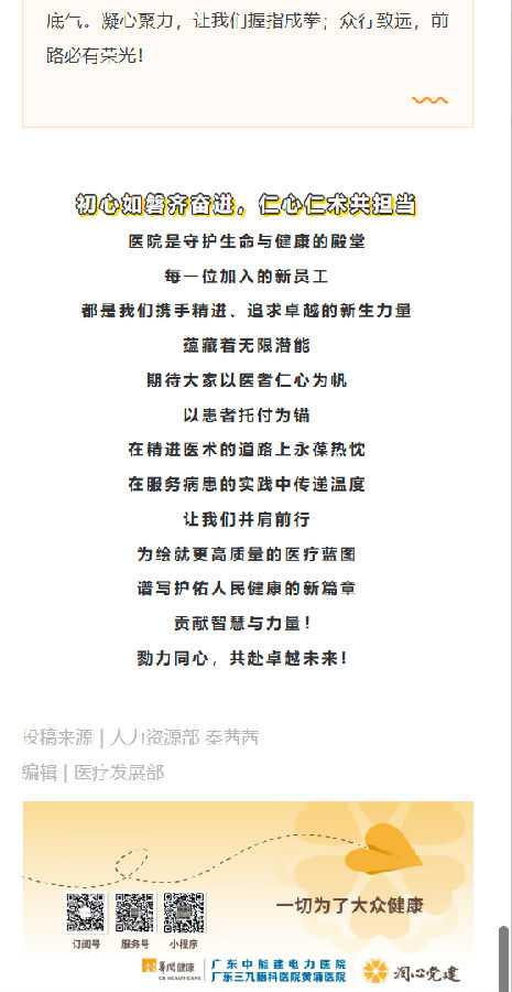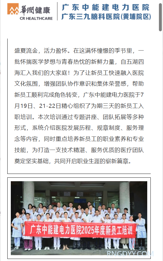 本院动态 联系电话:020-82078966 邮箱:rngd@crmedical.hk 【QQ咨询】: 凝“新”筑梦 “医”路同行 | 广东中能建电力医院2025年新员工入职培训暖心启航 http://www.rngdyy.com 时间:2025-07-25 编辑:广东中能建电力医院 阅读:279 上一篇:我为群众办实事 | 三伏天灸免费享,电力医院送健康 下一篇:本院动态 | 脑瘫科住院部及儿童康复治疗部搬迁之你问我答 我要评论: 相关报道: 本院动态 | 脑瘫科住院部及儿童康复治疗部搬迁之你问我答 润心分享 | 区域联动护光明,医养协作暖人心 警示教育敲警钟,守纪护廉树清风|广东中能建电力医院党支部组织参观广东省反腐倡廉教育基地 润心分享 | 断腕重生:医术铸就生命奇迹 谈判采购公告 | 广东中能建电力医院 供应室二层板房改造监理服务项目采购公告 本院动态 | 以考促学强基础,以练促精保安全 ——我院圆满完成2025年第二季度“三基三严”考核工作 润心分享 | 一例糖尿病高渗性昏迷合并酮症酸中毒病例分享及科普 圆满收官 | 电力医院2025年三伏天灸义诊活动深受市民好评! 地址:广州市黄埔区黄埔东路2957号志诚楼(门诊部) 黄埔东路3375号大院(住院部) 咨询:020-82078966 邮箱:rngd@crmedical.hk 传真:86(020) 82078027 患者服务小程序 官方订阅号 Copyright 2025 广东中能建电力医院版权所有 粤ICP备20049783号 服务性质:非营利性网站 粤公网安备 号