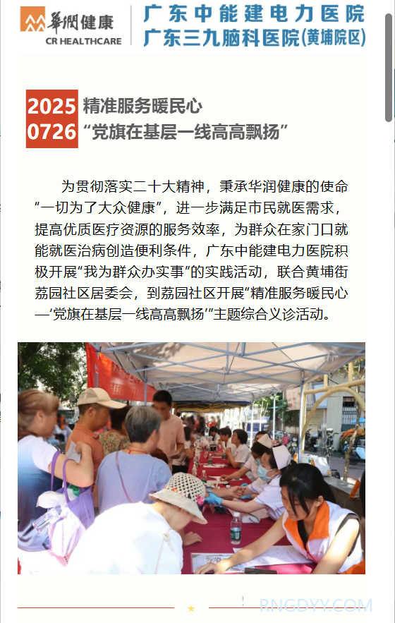 本院动态 联系电话:020-82078966 邮箱:rngd@crmedical.hk 【QQ咨询】: 精准服务暖民心 | 电力医院到黄埔街道荔园社区开展“精准服务暖民心—党旗在基层一线高高飘扬”综合义诊活动 http://www.rngdyy.com 时间:2025-07-29 编辑:广东中能建电力医院 阅读:275 上一篇:凝“新”筑梦 “医”路同行 | 广东中能建电力医院2025年新员工入职培训暖心启航 下一篇:本院动态 | 脑瘫科住院部及儿童康复治疗部搬迁之你问我答 我要评论: 相关报道: 本院动态 | 脑瘫科住院部及儿童康复治疗部搬迁之你问我答 润心分享 | 区域联动护光明,医养协作暖人心 警示教育敲警钟,守纪护廉树清风|广东中能建电力医院党支部组织参观广东省反腐倡廉教育基地 润心分享 | 断腕重生:医术铸就生命奇迹 谈判采购公告 | 广东中能建电力医院 供应室二层板房改造监理服务项目采购公告 本院动态 | 以考促学强基础,以练促精保安全 ——我院圆满完成2025年第二季度“三基三严”考核工作 润心分享 | 一例糖尿病高渗性昏迷合并酮症酸中毒病例分享及科普 圆满收官 | 电力医院2025年三伏天灸义诊活动深受市民好评! 地址:广州市黄埔区黄埔东路2957号志诚楼(门诊部) 黄埔东路3375号大院(住院部) 咨询:020-82078966 邮箱:rngd@crmedical.hk 传真:86(020) 82078027 患者服务小程序 官方订阅号 Copyright 2025 广东中能建电力医院版权所有 粤ICP备20049783号 服务性质:非营利性网站 粤公网安备 号