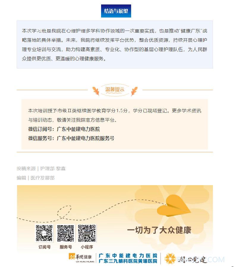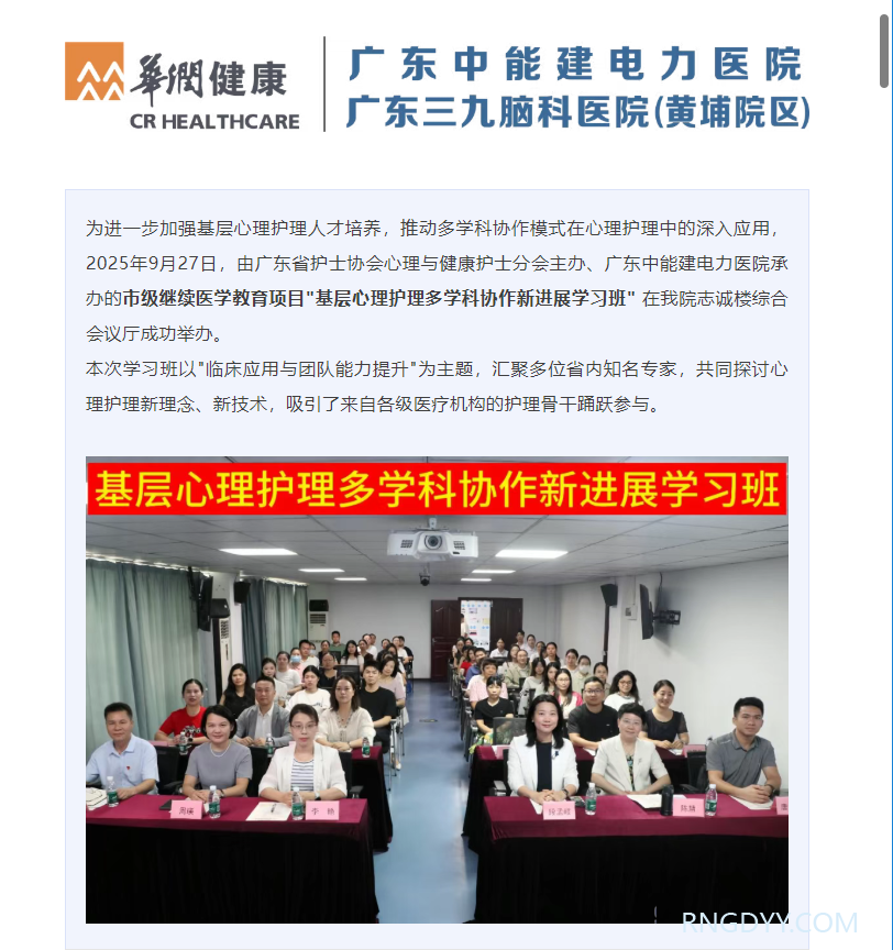 本院动态 联系电话:020-82078966 邮箱:rngd@crmedical.hk 【QQ咨询】: 赋能基层 · 护心前行|我院成功举办市级继续医学教育项目“基层心理护理多学科协作新进展学习班” http://www.rngdyy.com 时间:2025-09-29 编辑:广东中能建电力医院 阅读:11 上一篇:本院动态 | 脑瘫科住院部及儿童康复治疗部搬迁之你问我答 下一篇:我为群众办实事 | 电力医院到塘头雅苑开展“我为群众办实事,健康义诊进社区”综合义诊活动 我要评论: 相关报道: 本院动态 | 脑瘫科住院部及儿童康复治疗部搬迁之你问我答 润心分享 | 区域联动护光明,医养协作暖人心 警示教育敲警钟,守纪护廉树清风|广东中能建电力医院党支部组织参观广东省反腐倡廉教育基地 润心分享 | 断腕重生:医术铸就生命奇迹 谈判采购公告 | 广东中能建电力医院 供应室二层板房改造监理服务项目采购公告 本院动态 | 以考促学强基础,以练促精保安全 ——我院圆满完成2025年第二季度“三基三严”考核工作 润心分享 | 一例糖尿病高渗性昏迷合并酮症酸中毒病例分享及科普 圆满收官 | 电力医院2025年三伏天灸义诊活动深受市民好评! 地址:广州市黄埔区黄埔东路2957号志诚楼(门诊部) 黄埔东路3375号大院(住院部) 咨询:020-82078966 邮箱:rngd@crmedical.hk 传真:86(020) 82078027 患者服务小程序 官方订阅号 Copyright 2025 广东中能建电力医院版权所有 粤ICP备20049783号 服务性质:非营利性网站 粤公网安备 号