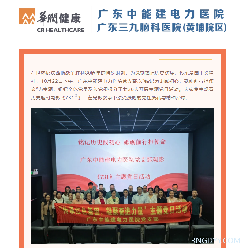 本院动态 联系电话:020-82078966 邮箱:rngd@crmedical.hk 【QQ咨询】: 铭记历史践初心,砥砺前行担使命 | 广东中能建电力医院党支部组织观看爱国影片《731》 http://www.rngdyy.com 时间:2025-10-23 编辑:广东中能建电力医院 阅读:20 上一篇:我为群众办实事 | 电力医院到塘头雅苑开展“我为群众办实事,健康义诊进社区”综合义诊活动 下一篇:激情全运 · 热血同行 | 广东中能建电力医院献血活动 我要评论: 相关报道: 我为群众办实事 | 电力医院到塘头雅苑开展“我为群众办实事,健康义诊进社区”综合义诊活动 本院动态 | 勠力同心拉练,护佑母婴安全 凝聚青春力量 谱写奋进新篇丨广东中能建电力医院团支部大会顺利召开 本院动态 | 广东中能建电力医院成功开展集中整治医德医风“学习教育月”活动 润心分享 | 25岁小伙疯狂健身差点凉凉! 本院动态 | 热烈祝贺脑瘫科新病区正式启用! 本院动态 | 筑牢安全防线,守护患者安康——电力医院心理行为科国庆节前全面安全排查工作纪实 本院动态 | 我院心理行为科受邀在全国护理学术盛会上分享人文关怀新模式 地址:广州市黄埔区黄埔东路2957号志诚楼(门诊部) 黄埔东路3375号大院(住院部) 咨询:020-82078966 邮箱:rngd@crmedical.hk 传真:86(020) 82078027 患者服务小程序 官方订阅号 Copyright 2025 广东中能建电力医院版权所有 粤ICP备20049783号 服务性质:非营利性网站 粤公网安备 号