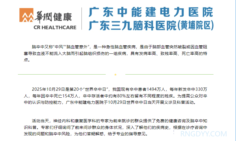 本院动态 联系电话:020-82078966 邮箱:rngd@crmedical.hk 【QQ咨询】: 世界卒中日 | 尽早识别·立刻就医——广东中能建电力医院开展2025年世界卒中日科普宣教义诊活动 http://www.rngdyy.com 时间:2025-10-31 编辑:广东中能建电力医院 阅读:21 上一篇:我为群众办实事 | 电力医院到新港社区开展“我为群众办实事,健康义诊进社区”综合义诊活动 下一篇:激情全运 · 热血同行 | 广东中能建电力医院献血活动 我要评论: 相关报道: 我为群众办实事 | 电力医院到塘头雅苑开展“我为群众办实事,健康义诊进社区”综合义诊活动 本院动态 | 勠力同心拉练,护佑母婴安全 凝聚青春力量 谱写奋进新篇丨广东中能建电力医院团支部大会顺利召开 本院动态 | 广东中能建电力医院成功开展集中整治医德医风“学习教育月”活动 润心分享 | 25岁小伙疯狂健身差点凉凉! 本院动态 | 热烈祝贺脑瘫科新病区正式启用! 本院动态 | 筑牢安全防线,守护患者安康——电力医院心理行为科国庆节前全面安全排查工作纪实 本院动态 | 我院心理行为科受邀在全国护理学术盛会上分享人文关怀新模式 地址:广州市黄埔区黄埔东路2957号志诚楼(门诊部) 黄埔东路3375号大院(住院部) 咨询:020-82078966 邮箱:rngd@crmedical.hk 传真:86(020) 82078027 患者服务小程序 官方订阅号 Copyright 2025 广东中能建电力医院版权所有 粤ICP备20049783号 服务性质:非营利性网站 粤公网安备 号