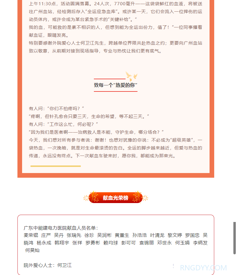 本院动态 联系电话:020-82078966 邮箱:rngd@crmedical.hk 【QQ咨询】: 激情全运 · 热血同行 | 广东中能建电力医院献血活动 http://www.rngdyy.com 时间:2025-11-05 编辑:广东中能建电力医院 阅读:19 上一篇:世界卒中日 | 尽早识别·立刻就医——广东中能建电力医院开展2025年世界卒中日科普宣教义诊活动 下一篇:--敬请期待-- 我要评论: 相关报道: 我为群众办实事 | 电力医院到塘头雅苑开展“我为群众办实事,健康义诊进社区”综合义诊活动 本院动态 | 勠力同心拉练,护佑母婴安全 凝聚青春力量 谱写奋进新篇丨广东中能建电力医院团支部大会顺利召开 本院动态 | 广东中能建电力医院成功开展集中整治医德医风“学习教育月”活动 润心分享 | 25岁小伙疯狂健身差点凉凉! 本院动态 | 热烈祝贺脑瘫科新病区正式启用! 本院动态 | 筑牢安全防线,守护患者安康——电力医院心理行为科国庆节前全面安全排查工作纪实 本院动态 | 我院心理行为科受邀在全国护理学术盛会上分享人文关怀新模式 地址:广州市黄埔区黄埔东路2957号志诚楼(门诊部) 黄埔东路3375号大院(住院部) 咨询:020-82078966 邮箱:rngd@crmedical.hk 传真:86(020) 82078027 患者服务小程序 官方订阅号 Copyright 2025 广东中能建电力医院版权所有 粤ICP备20049783号 服务性质:非营利性网站 粤公网安备 号