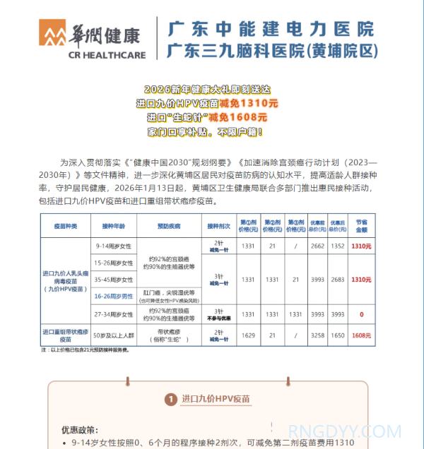 本院动态 联系电话:020-82078966 邮箱:rngd@crmedical.hk 【QQ咨询】: 惠民接种活动 | 进口九价HPV疫苗、进口重组带状疱疹疫苗均可优惠接种,速速关注了解! http://www.rngdyy.com 时间:2026-01-15 编辑:广东中能建电力医院 阅读:46 上一篇:福暖慢天使!这场元旦游园会,让康复路上满是星光 下一篇:复盘过往,擘画蓝图——广东中能建电力医院2025年度总结表彰大会圆满举行 我要评论: 相关报道: 复盘过往,擘画蓝图——广东中能建电力医院2025年度总结表彰大会圆满举行 春节不打烊 | 广东中能建电力医院(广东三九脑科医院黄埔医院)春节正常开诊 喜报!我院获十五运会和残特奥会广州赛区执委会感谢信表彰 本院动态 | 我院收到一封来自“12345”的特殊诉求单 喜讯!广东中能建电力医院正式增名“广东三九脑科医院黄埔医院” 开诊通知 | 长期失眠、多梦?睡眠门诊今日起正式接诊,助你安享好眠 开诊通知 | 头痛、头晕反复缠?2月2日起,头痛头晕门诊正式开诊,精准诊疗解困扰 本院动态 | “凝聚力量·绽放光芒”广东中能建电力医院举办2026年度辞旧迎新趣味运动会 地址:广州市黄埔区黄埔东路2957号志诚楼(门诊部) 黄埔东路3375号大院(住院部) 咨询:020-82078966 邮箱:rngd@crmedical.hk 传真:86(020) 82078027 患者服务小程序 官方订阅号 Copyright 2026 广东中能建电力医院版权所有 粤ICP备20049783号 服务性质:非营利性网站 粤公网安备 号