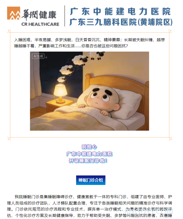本院动态 联系电话:020-82078966 邮箱:rngd@crmedical.hk 【QQ咨询】: 开诊通知 | 长期失眠、多梦?睡眠门诊今日起正式接诊,助你安享好眠 http://www.rngdyy.com 时间:2026-02-02 编辑:广东中能建电力医院 阅读:85 上一篇:本院动态 | “凝聚力量·绽放光芒”广东中能建电力医院举办2026年度辞旧迎新趣味运动会 下一篇:复盘过往,擘画蓝图——广东中能建电力医院2025年度总结表彰大会圆满举行 我要评论: 相关报道: 复盘过往,擘画蓝图——广东中能建电力医院2025年度总结表彰大会圆满举行 春节不打烊 | 广东中能建电力医院(广东三九脑科医院黄埔医院)春节正常开诊 喜报!我院获十五运会和残特奥会广州赛区执委会感谢信表彰 本院动态 | 我院收到一封来自“12345”的特殊诉求单 喜讯!广东中能建电力医院正式增名“广东三九脑科医院黄埔医院” 开诊通知 | 长期失眠、多梦?睡眠门诊今日起正式接诊,助你安享好眠 开诊通知 | 头痛、头晕反复缠?2月2日起,头痛头晕门诊正式开诊,精准诊疗解困扰 本院动态 | “凝聚力量·绽放光芒”广东中能建电力医院举办2026年度辞旧迎新趣味运动会 地址:广州市黄埔区黄埔东路2957号志诚楼(门诊部) 黄埔东路3375号大院(住院部) 咨询:020-82078966 邮箱:rngd@crmedical.hk 传真:86(020) 82078027 患者服务小程序 官方订阅号 Copyright 2026 广东中能建电力医院版权所有 粤ICP备20049783号 服务性质:非营利性网站 粤公网安备 号