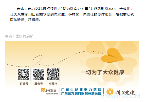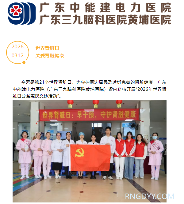 本院动态 联系电话:020-82078966 邮箱:rngd@crmedical.hk 【QQ咨询】: 世界肾脏日 | 关爱肾脏健康——电力医院肾内科开展“2026年世界肾脏日公益惠民义诊活动” http://www.rngdyy.com 时间:2026-03-12 编辑:广东中能建电力医院 阅读:19 上一篇:世界睡眠日 | 电力医院到火村岗头园安置房开展“优质睡眠,美好生活”世界睡眠日综合义诊活动 下一篇:--敬请期待-- 我要评论: 相关报道: 关于调整综合诊查类、妇科类、心血管系统类等医疗服务项目价格的公示 当患者想拔掉那根“管”——血液净化科人文关怀纪实:把诊疗送到家,把温暖送进心 世界昏迷日 | 电力医院在门诊一楼大厅开展世界昏迷日主题综合义诊活动 世界睡眠日 | 电力医院到火村岗头园安置房开展“优质睡眠,美好生活”世界睡眠日综合义诊活动 世界肾脏日 | 关爱肾脏健康——电力医院肾内科开展“2026年世界肾脏日公益惠民义诊活动” 复盘过往,擘画蓝图——广东中能建电力医院2025年度总结表彰大会圆满举行 春节不打烊 | 广东中能建电力医院(广东三九脑科医院黄埔医院)春节正常开诊 喜报!我院获十五运会和残特奥会广州赛区执委会感谢信表彰 地址:广州市黄埔区黄埔东路2957号志诚楼(门诊部) 黄埔东路3375号大院(住院部) 咨询:020-82078966 邮箱:rngd@crmedical.hk 传真:86(020) 82078027 患者服务小程序 官方订阅号 Copyright 2026 广东中能建电力医院版权所有 粤ICP备20049783号 服务性质:非营利性网站 粤公网安备 号