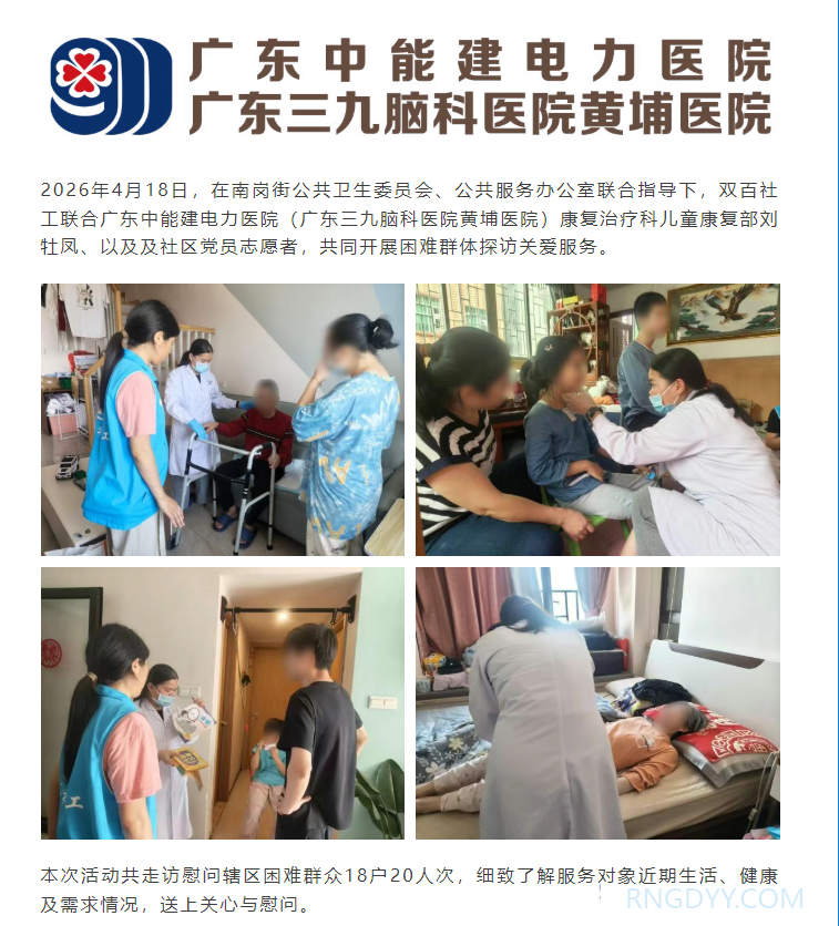 本院动态 联系电话:020-82078966 邮箱:rngd@crmedical.hk 【QQ咨询】: 多方携手送温暖 精准帮扶暖人心 | 我院联合南岗街多部门开展困难群体关爱探访活动 http://www.rngdyy.com 时间:2026-04-21 编辑:广东中能建电力医院 阅读:19 上一篇:本院动态 | 夯实区域一体化建设成果 共促医疗质量安全提升——脑科总院医务部莅临我院开展交流访谈 下一篇:本院动态 | 我院走进怡园小学,为特殊儿童家庭送上青春期教育“暖心课” 我要评论: 相关报道: 本院动态 | 我院走进怡园小学,为特殊儿童家庭送上青春期教育“暖心课” 医校携手 守护成长 | 广东中能建电力医院与新港中学圆满举行医校共建签约活动 多方携手送温暖 精准帮扶暖人心 | 我院联合南岗街多部门开展困难群体关爱探访活动 关于调整综合诊查类、妇科类、心血管系统类等医疗服务项目价格的公示 当患者想拔掉那根“管”——血液净化科人文关怀纪实:把诊疗送到家,把温暖送进心 巾帼绽芳华·奋进她力量 | 致敬医院里闪闪发光的“她” 芳华自在,为爱绽放|广东中能建电力医院妇女节活动圆满举行 元宵暖病房 医患共团圆!全院多科室送温情,汤圆甜入心间 地址:广州市黄埔区黄埔东路2957号志诚楼(门诊部) 黄埔东路3375号大院(住院部) 咨询:020-82078966 邮箱:rngd@crmedical.hk 传真:86(020) 82078027 患者服务小程序 官方订阅号 Copyright 2026 广东中能建电力医院版权所有 粤ICP备20049783号 服务性质:非营利性网站 粤公网安备 号