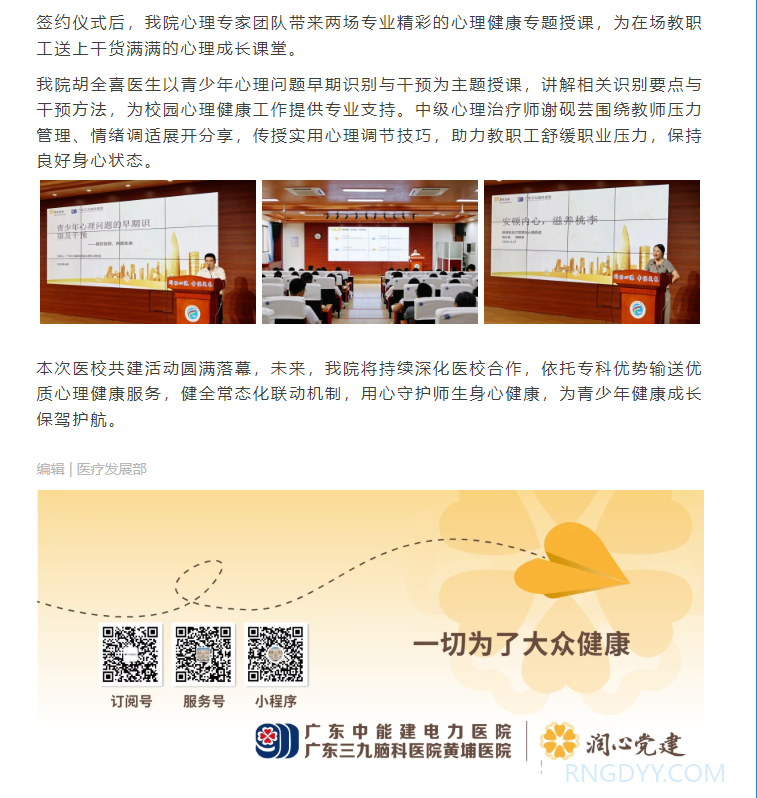 本院动态 联系电话:020-82078966 邮箱:rngd@crmedical.hk 【QQ咨询】: 医校携手 守护成长 | 广东中能建电力医院与新港中学圆满举行医校共建签约活动 http://www.rngdyy.com 时间:2026-04-22 编辑:广东中能建电力医院 阅读:20 上一篇:多方携手送温暖 精准帮扶暖人心 | 我院联合南岗街多部门开展困难群体关爱探访活动 下一篇:本院动态 | 我院走进怡园小学,为特殊儿童家庭送上青春期教育“暖心课” 我要评论: 相关报道: 本院动态 | 我院走进怡园小学,为特殊儿童家庭送上青春期教育“暖心课” 医校携手 守护成长 | 广东中能建电力医院与新港中学圆满举行医校共建签约活动 多方携手送温暖 精准帮扶暖人心 | 我院联合南岗街多部门开展困难群体关爱探访活动 关于调整综合诊查类、妇科类、心血管系统类等医疗服务项目价格的公示 当患者想拔掉那根“管”——血液净化科人文关怀纪实:把诊疗送到家,把温暖送进心 巾帼绽芳华·奋进她力量 | 致敬医院里闪闪发光的“她” 芳华自在,为爱绽放|广东中能建电力医院妇女节活动圆满举行 元宵暖病房 医患共团圆!全院多科室送温情,汤圆甜入心间 地址:广州市黄埔区黄埔东路2957号志诚楼(门诊部) 黄埔东路3375号大院(住院部) 咨询:020-82078966 邮箱:rngd@crmedical.hk 传真:86(020) 82078027 患者服务小程序 官方订阅号 Copyright 2026 广东中能建电力医院版权所有 粤ICP备20049783号 服务性质:非营利性网站 粤公网安备 号