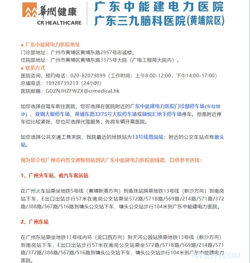 就医指南 联系电话:020-82078966 邮箱:rngd@crmedical.hk 【QQ咨询】: 广东中能建电力医院乘车指南 http://www.rngdyy.com 时间:2025-11-24 编辑:广东中能建电力医院 阅读:3 上一篇:通知公告 | 广东中能建电力医院推行“一次挂号管三天”惠民便民服务举措 下一篇:--敬请期待-- 我要评论: 相关报道: 预约挂号、报告查询、门诊缴费……我院润心患者服务小程序全搞定! 广东中能建电力医院健康体检须知及结果查询 地址:广州市黄埔区黄埔东路2957号志诚楼(门诊部) 黄埔东路3375号大院(住院部) 咨询:020-82078966 邮箱:rngd@crmedical.hk 传真:86(020) 82078027 患者服务小程序 官方订阅号 Copyright 2026 广东中能建电力医院版权所有 粤ICP备20049783号 服务性质:非营利性网站 粤公网安备 号